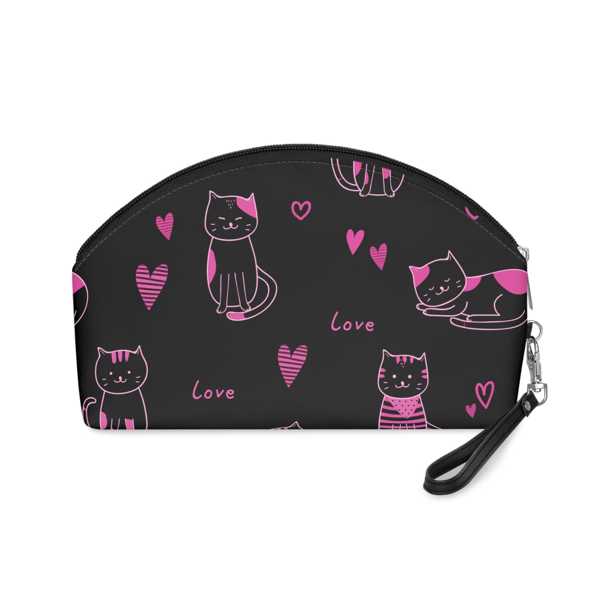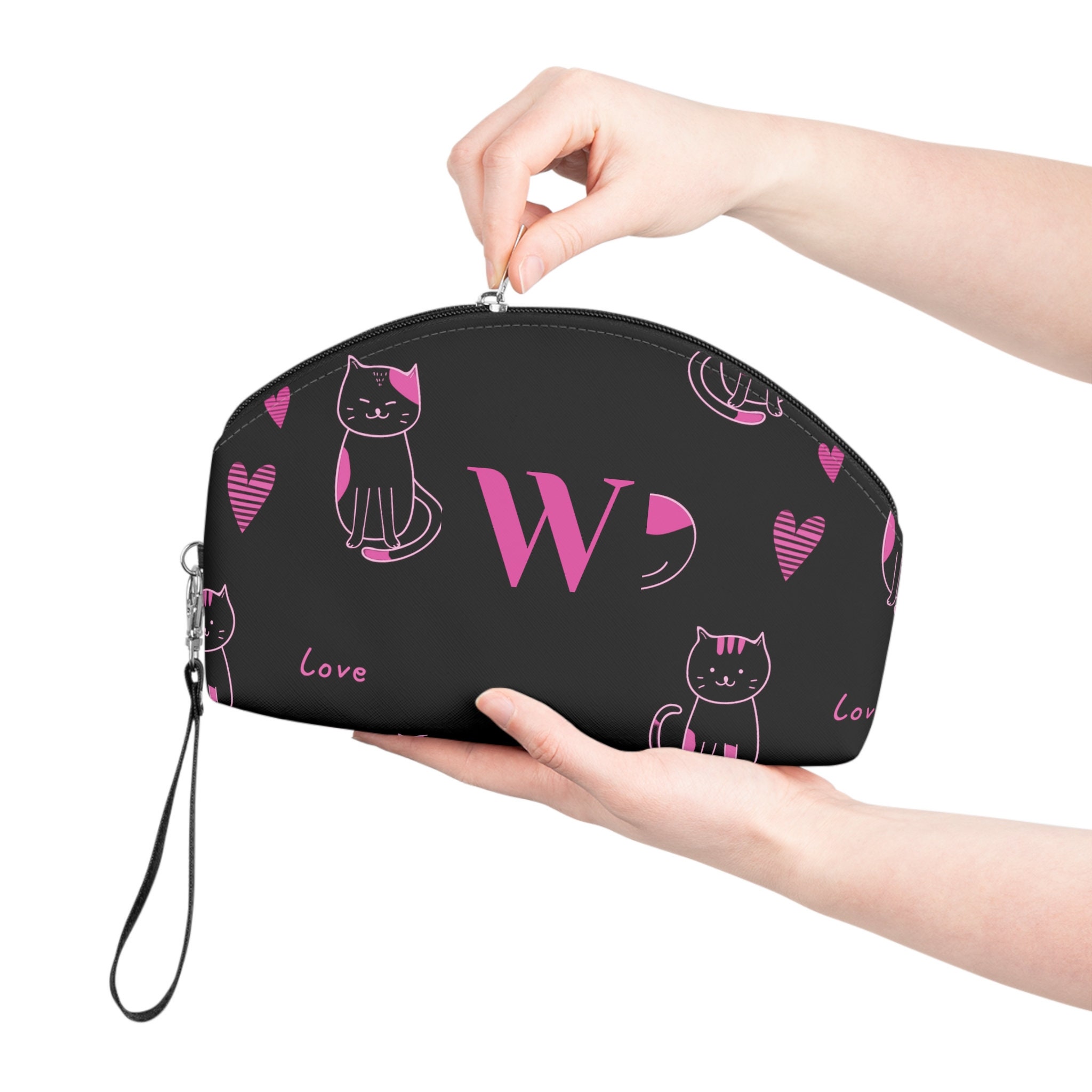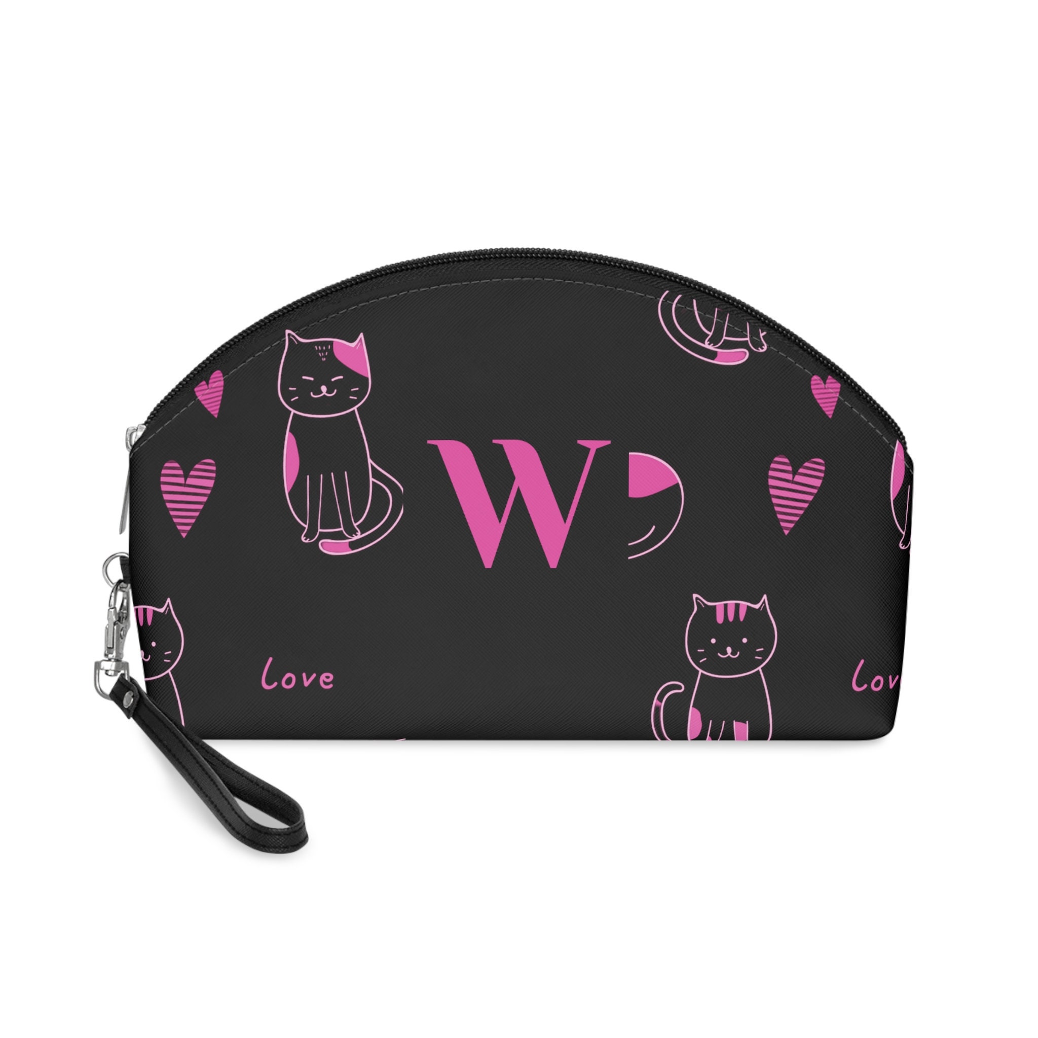 Pink Love Cats Black Makeup Bag, Accessory Bag, Personalized Cosmetic Bag, Women's Bag, Initial W